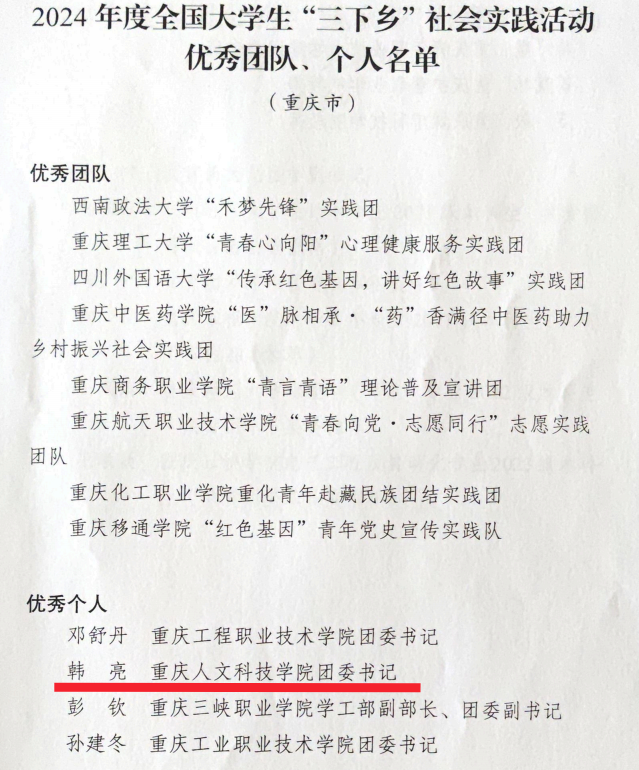 韩亮老师曾多次作为指导教师带队大学生参加暑期“三下乡”社会实践活动,指导的团队学生多次获得重庆市“三下乡”社会实践活动“优秀个人”称号,多个团队先后获得全国“三下乡”社会实践优秀团队”和重庆市“三下乡”社会实践活动“优秀团队”。指导的三下乡队伍开展的实践项目、调研报告先后在中国大学生在线“大我青春”暑期社会实践成果征集展示活动中获“实践风采类优秀作品”,重庆市“三下乡”社会实践成果遴选活动中获“调研报告优秀奖”和“实践项目优秀奖”。团队受到中青网、华龙网、上游新闻等主流媒体报道120余篇,制作原创微视频20余个,用实际行动为乡村振兴贡献人科力量。
