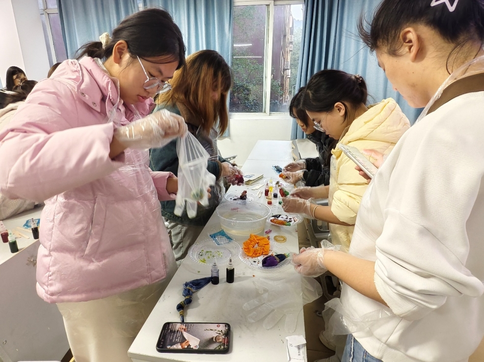 2025年11月21日,中小学心理研习社在9教308教室举办了“匠心扎染·独韵方巾创作”活动。本次活动共有19名同学参与,平均满意度高达9.9分。